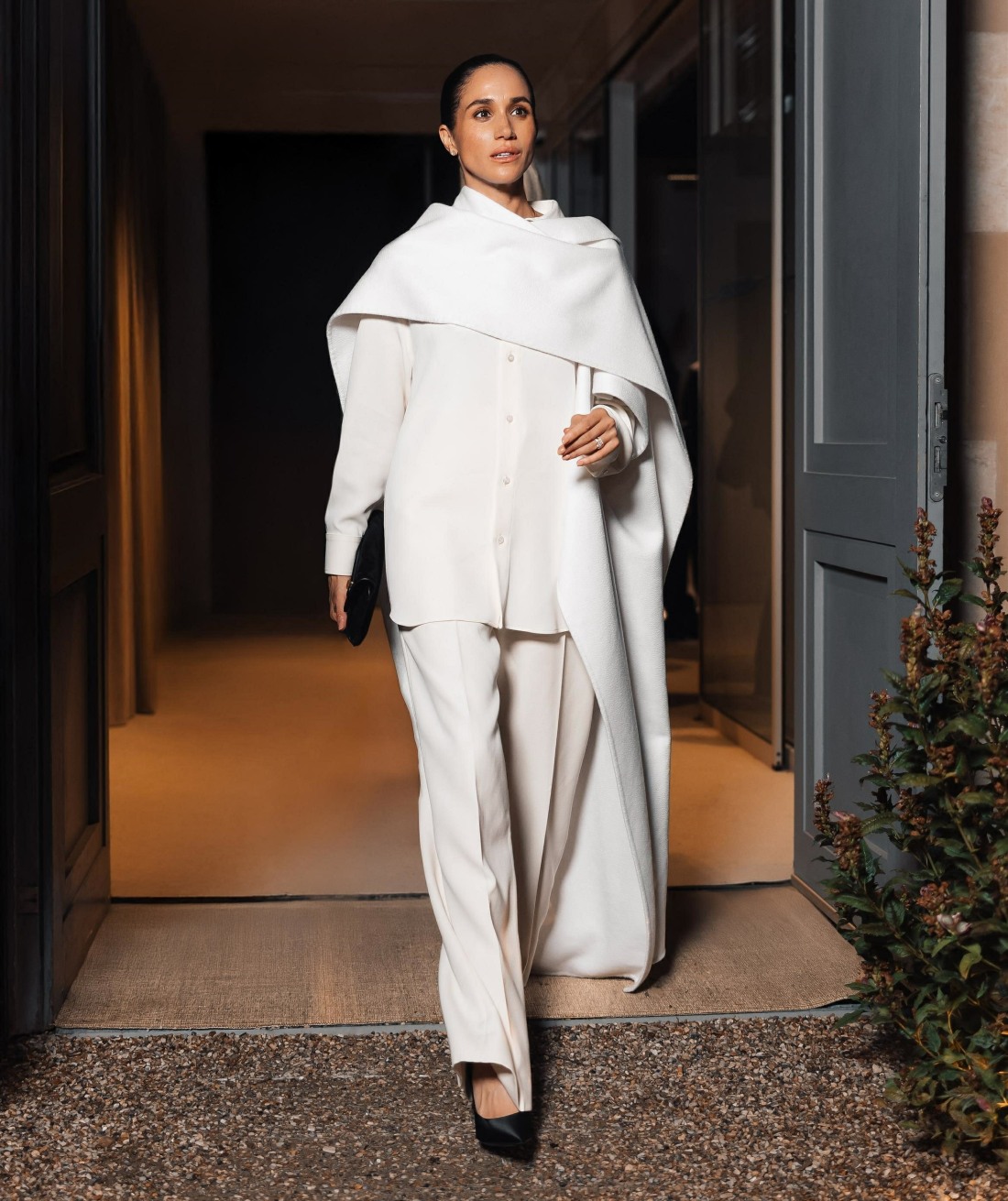 Paris, FRANCE Meghan Markle was seen leaving her hotel on her way to the Balenciaga show during Paris Fashion Week, wearing a stylish white oversized cape over a white button-down shirt. She paired it with black pointed-toe heels and simple accessories, giving off a vibe of effortless elegance, topped off with a sleek, slicked-back bun.