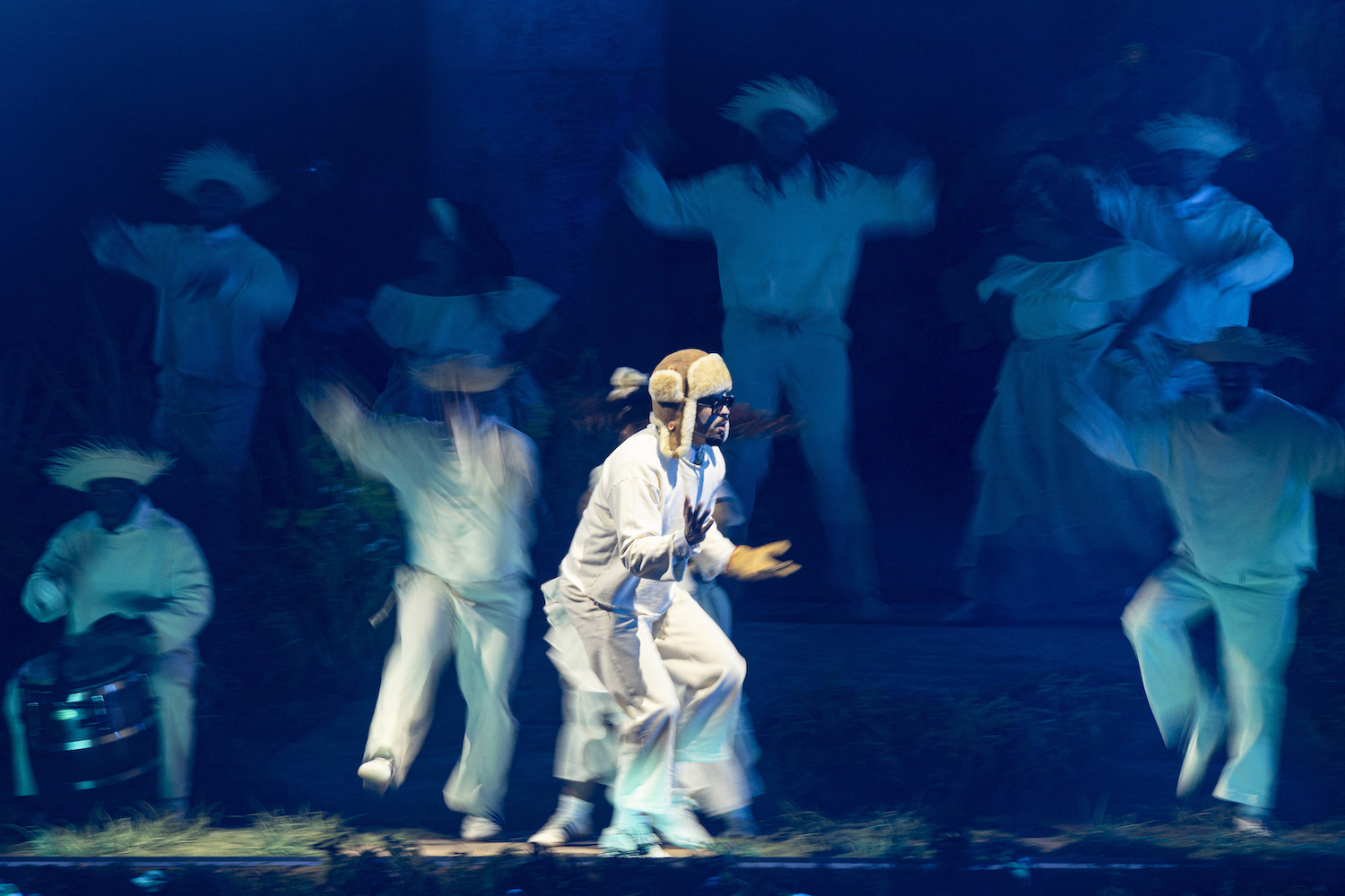 The spectacle opens theatrically: At center stage, a woman searches for a camera. At the same time, a man finds a blanket covering drums used for plena, a traditional Puerto Rican genre. Slowly, out of the mountain, dancers emerge donning traditional jíbaro garb worn in Boricua folk tradition, some complete with pava straw hats (an unofficial symbol of this era that doubles as a show of Puerto Rican pride). The man of the hour subtly appears stage-left, kicking off the night with new song “ALAMBRE PúA”.