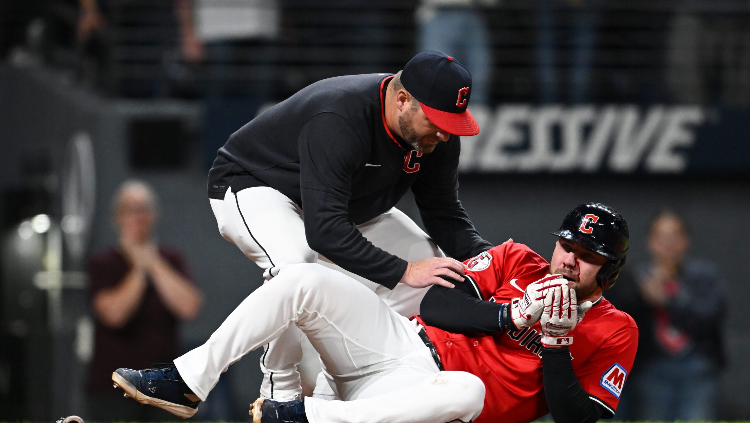 Guardians and Tigers players were visibly stunned as medics rushed to Fry’s side. An encouraging sign emerged, though, when Fry was able to stand up and walk onto the medical cart. He held a towel to his face to stop the bleeding.