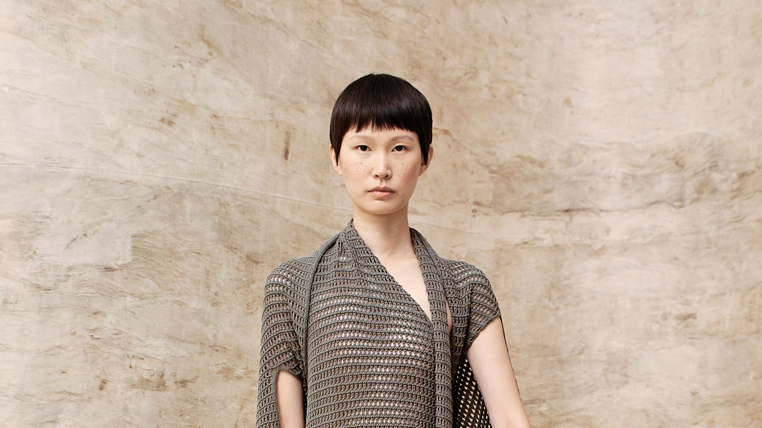 In a sense the whole collection was about order and irregularity. The strong shouldered V-silhouette seen in many of the looks was created, Manoogian said, by layering them over the single-button vest top (look 16). This outfit’s neatness contrasted with the asymmetry of an ivory knit dress (look 20), pieced together like a minimal Piet Mondrian. A knit woven with regular squares and cut in a square shape fell in an undisciplined drape; parachute pieces were irregular in their tautness, and Manoogian took advantage of the natural roll of some knit fabrics. The idea, explained Fireoved, was “embracing the imperfections of what handmade actually means.”