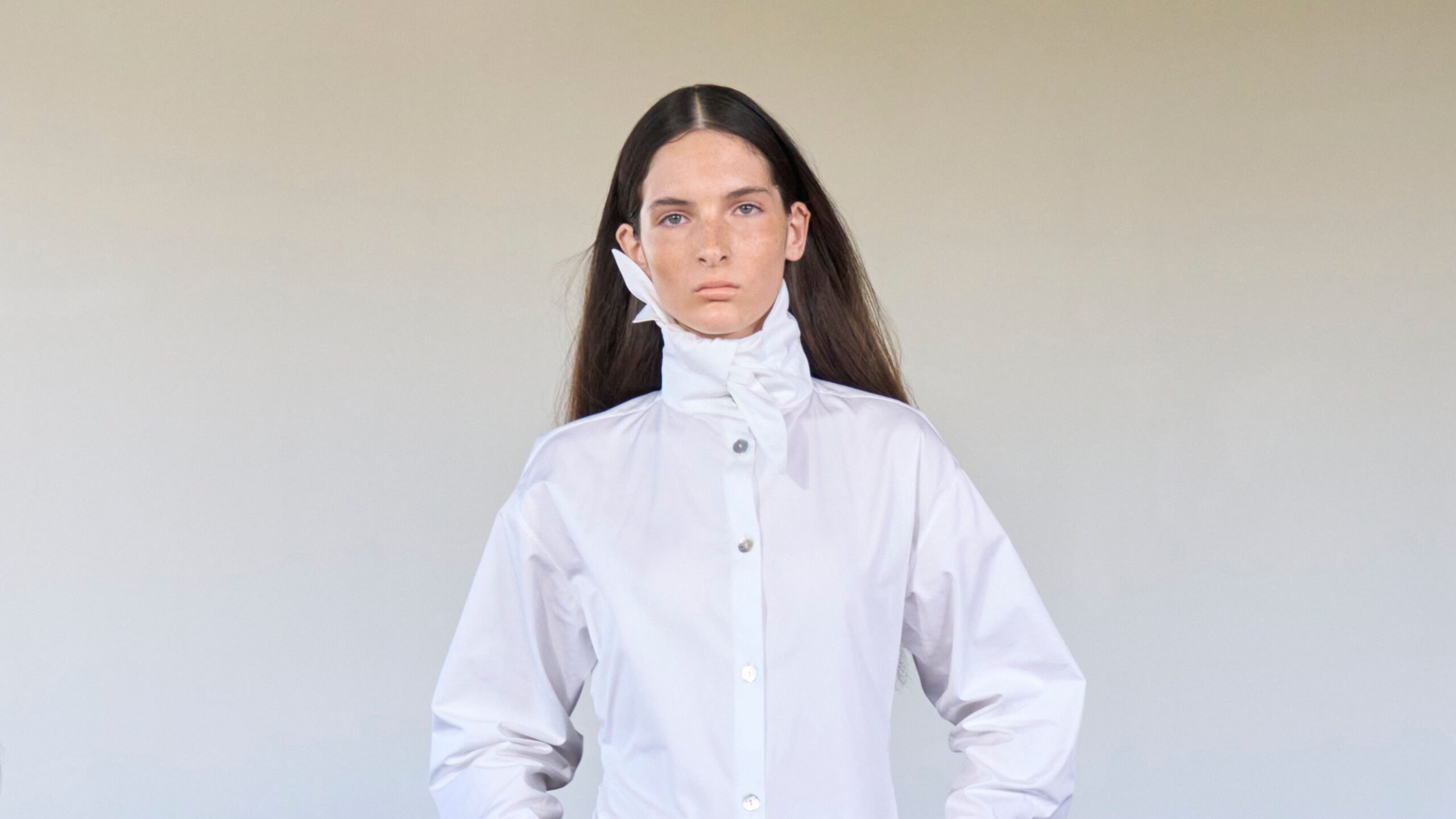Though edible confections were absent on show day, Lipkin-Connor instead delivered seasonal delights in the form of studded leather charms that swung from a weekender-proportioned take on her signature Bolter bag, leather sunglass holders suspended from models’ necks, and towel holders thrown over their shoulders. Eyewear was integrated into the fabric of the clothes. A bead-and-crystal waistcoat, worn atop a gray sweater, got the iPhones poised. These could be considered “finishing touches,” but they’re customary tidbits that are intrinsic to the woman (or women) she has created. Because if you looked closely at everything, there was an effortless attention to detail: a skewed knotted flourish in place of a traditional collar on shirting; a dropped shoulder on a cardigan, informed by knitwear her great-uncle sold at her namesake boutique, Lucinda Byre. “It should be very real,” she said. Everything was meticulously thought through.
